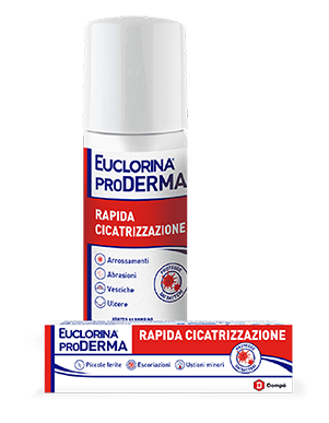 Euclorina® ProDERMA Rapida Cicatrizzazione favorisce una rapida cicatrizzazione delle ferite, creando una barriera protettiva contro le aggressioni microbiche e favorendo i processi di rigenerazione tissutale.